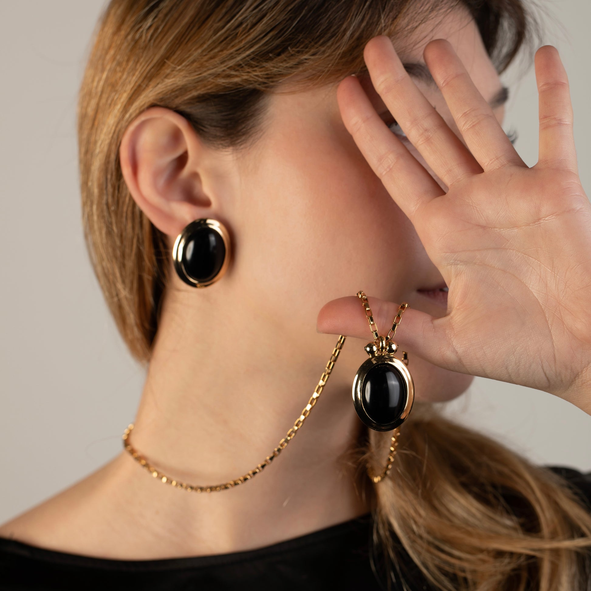 Nuestros KORAs son los must-haves que no podrás dejar de usar. Están elaborados en latón hipoalergénico con piedras color negro sobre una base bañada en oro de 24kt.